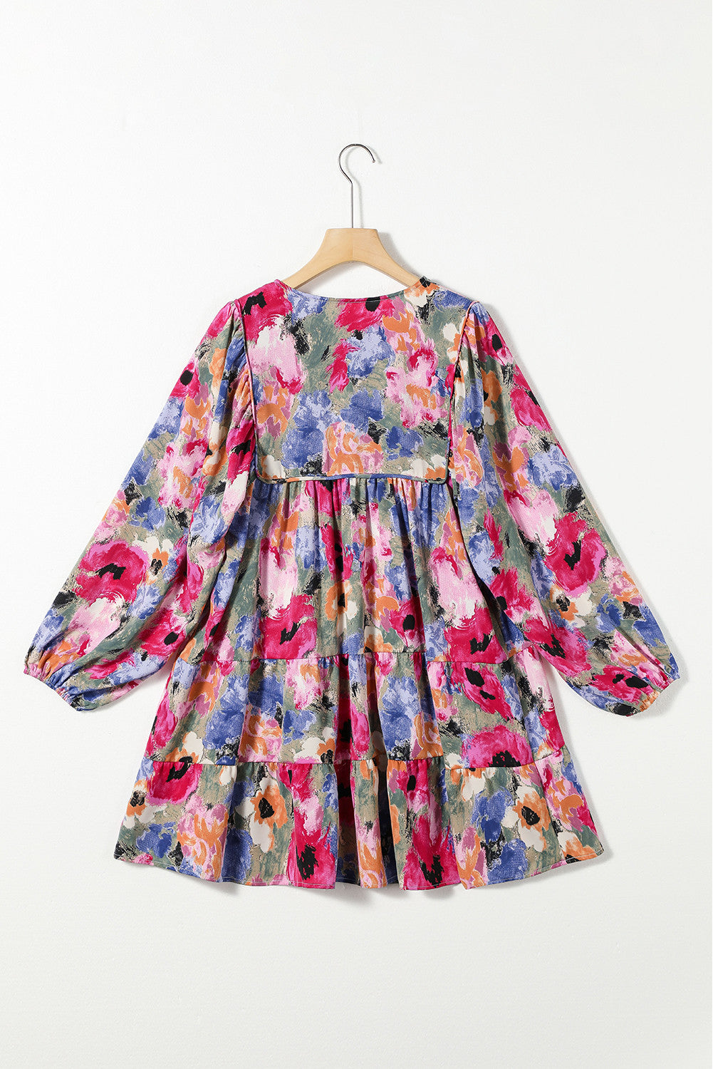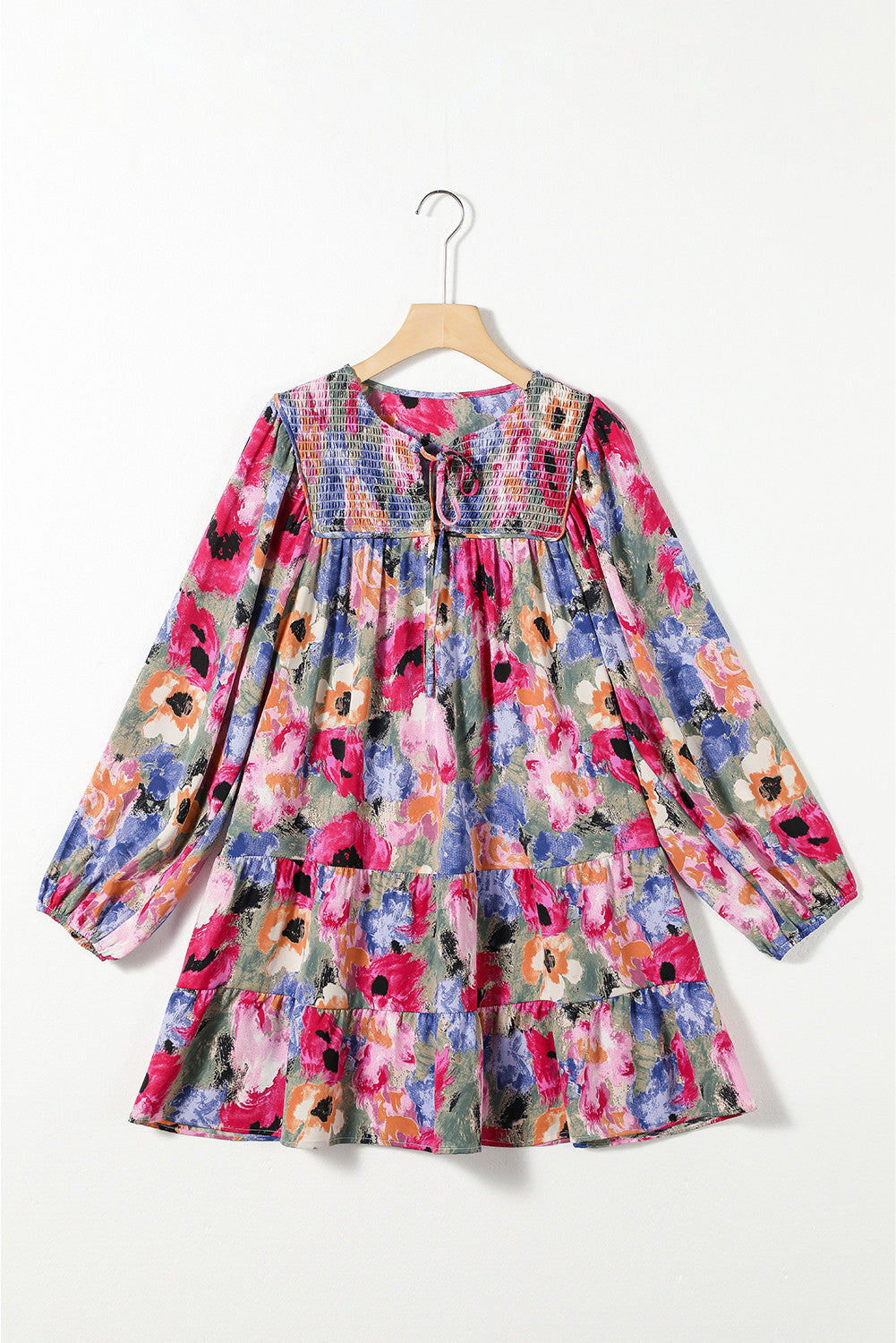 Embrace playful charm with this floral shift dress featuring a relaxed fit and elegant bubble sleeves. The split neck with a lace-up tie and smocked yoke add whimsical detail, while the ruffled hemline brings a fun, flirty finish. Perfectly versatile, it pairs effortlessly with boots or heels for any occasion.