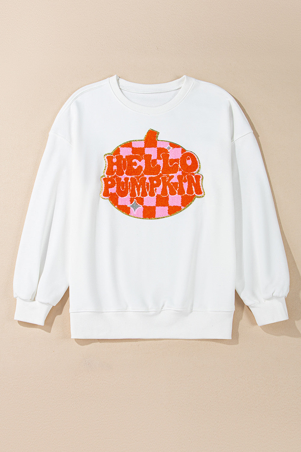 This cozy piece with a round neck promises all-day comfort while pumpkin and checkered chenille patches bring a fun, trendy vibe. Sparkling glitter details add just the right amount of sparkle, making it the perfect pick to brighten up your seasonal style with a playful twist.