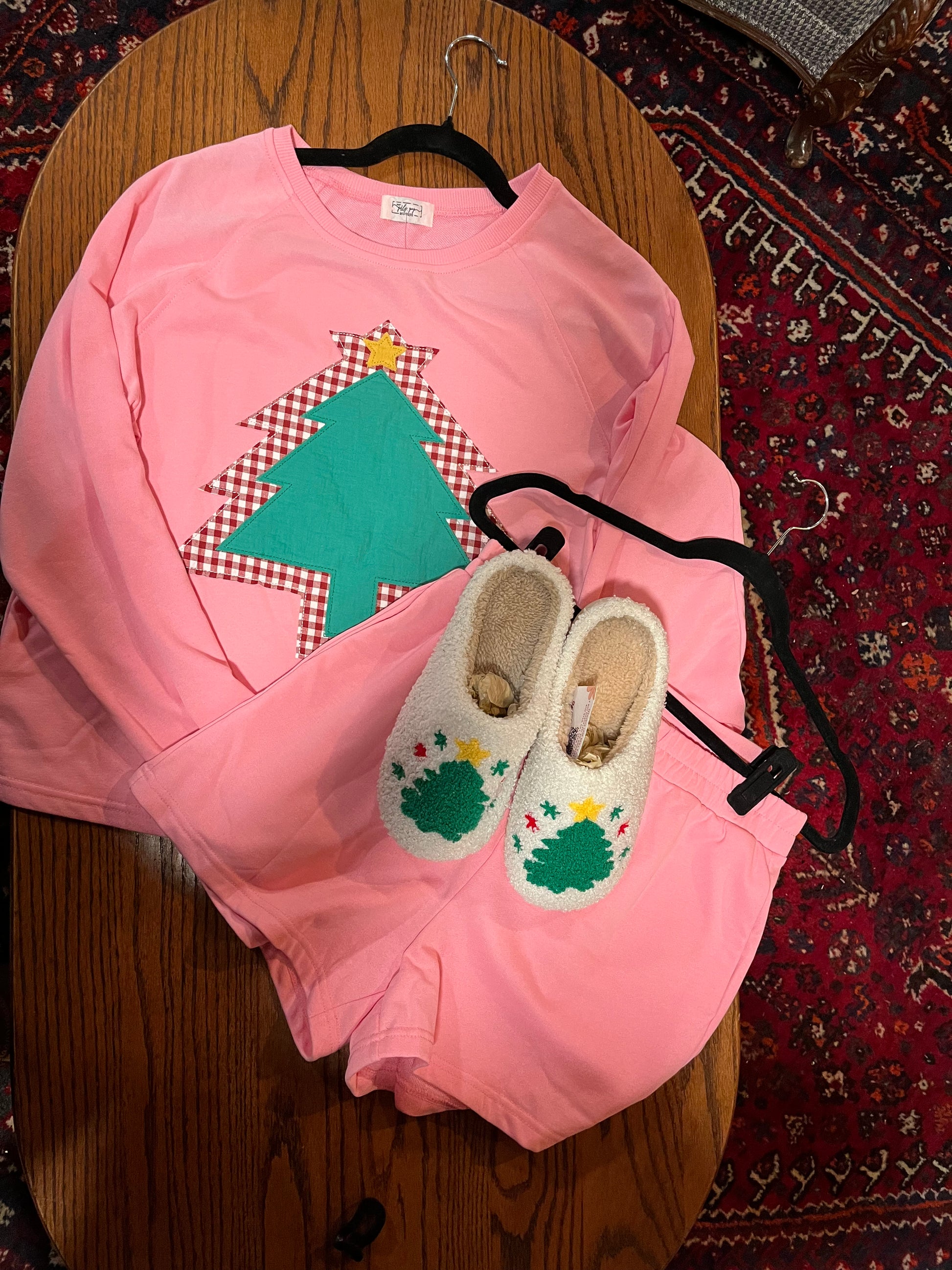 Get ready to sleigh the holiday season in this adorable plaid and green Christmas tree graphic pullover! Featuring a cozy raglan sleeve design, this playful piece pairs perfectly with matching shorts for an effortless coordinated look. Crafted from soft, breathable fabric, it's ideal for lounging, casual wear, or gifting to your favorite holiday lover. This two-piece set brings festive cheer and comfort together—because looking cute shouldn't mean sacrificing coziness!
