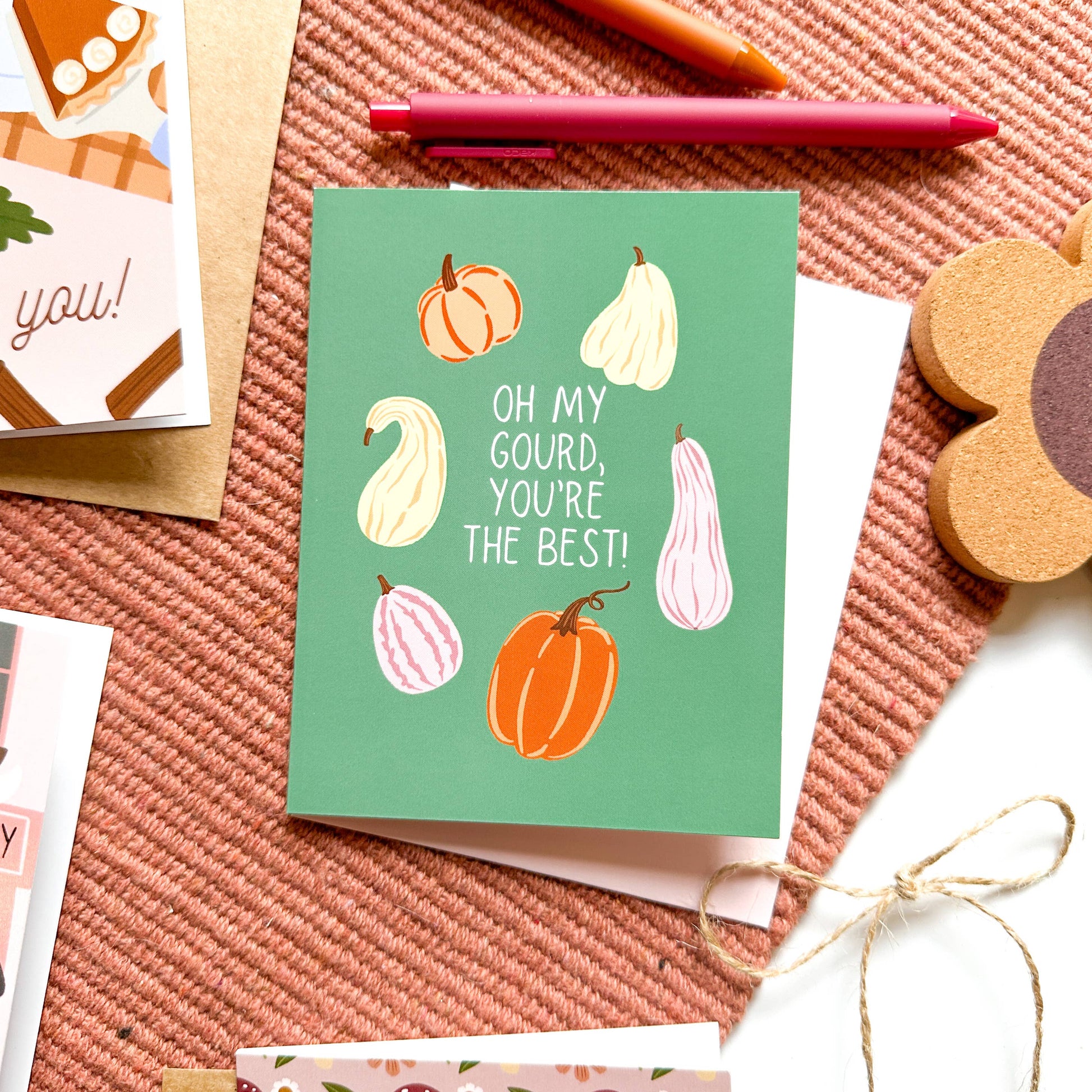 Celebrate the warmth and gratitude of Fall and Thanksgiving with our beautifully designed A2 greeting card, crafted by a myself, a female artist. This exquisite card features heartfelt artwork and thoughtful details that capture the essence of the holiday season. Proudly printed in the USA, each card reflects our own love of the holidays, puns, and expressing creativity. Perfect for sharing your gratitude with loved ones, this card is a delightful way to express your thanks and spread joy. Details: -Size A2 (4.25"x5.5") -Includes coordinating envelope -Blank Inside