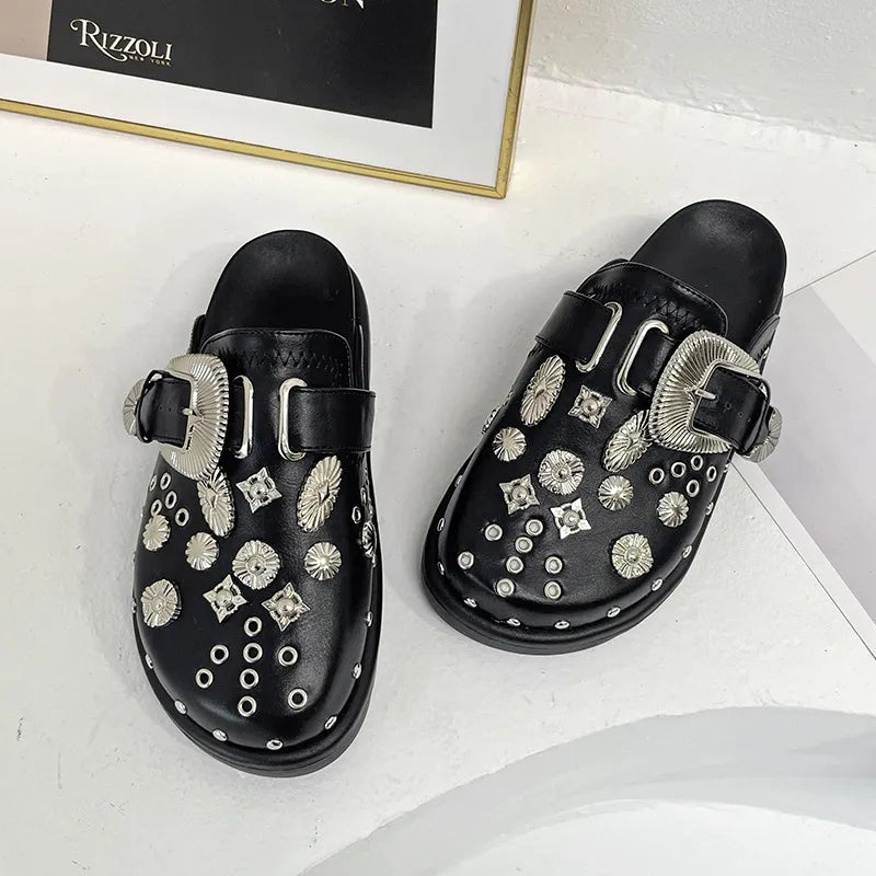 Step up your shoe game with these bold black clogs, detailed with eye-catching silver studs and concho-inspired accents. The oversized western buckle adds a statement touch, while the slip-on style keeps them effortless and comfortable. Perfect for pairing with denim, dresses, or your favorite casual looks, these clogs bring just the right mix of edgy and chic.