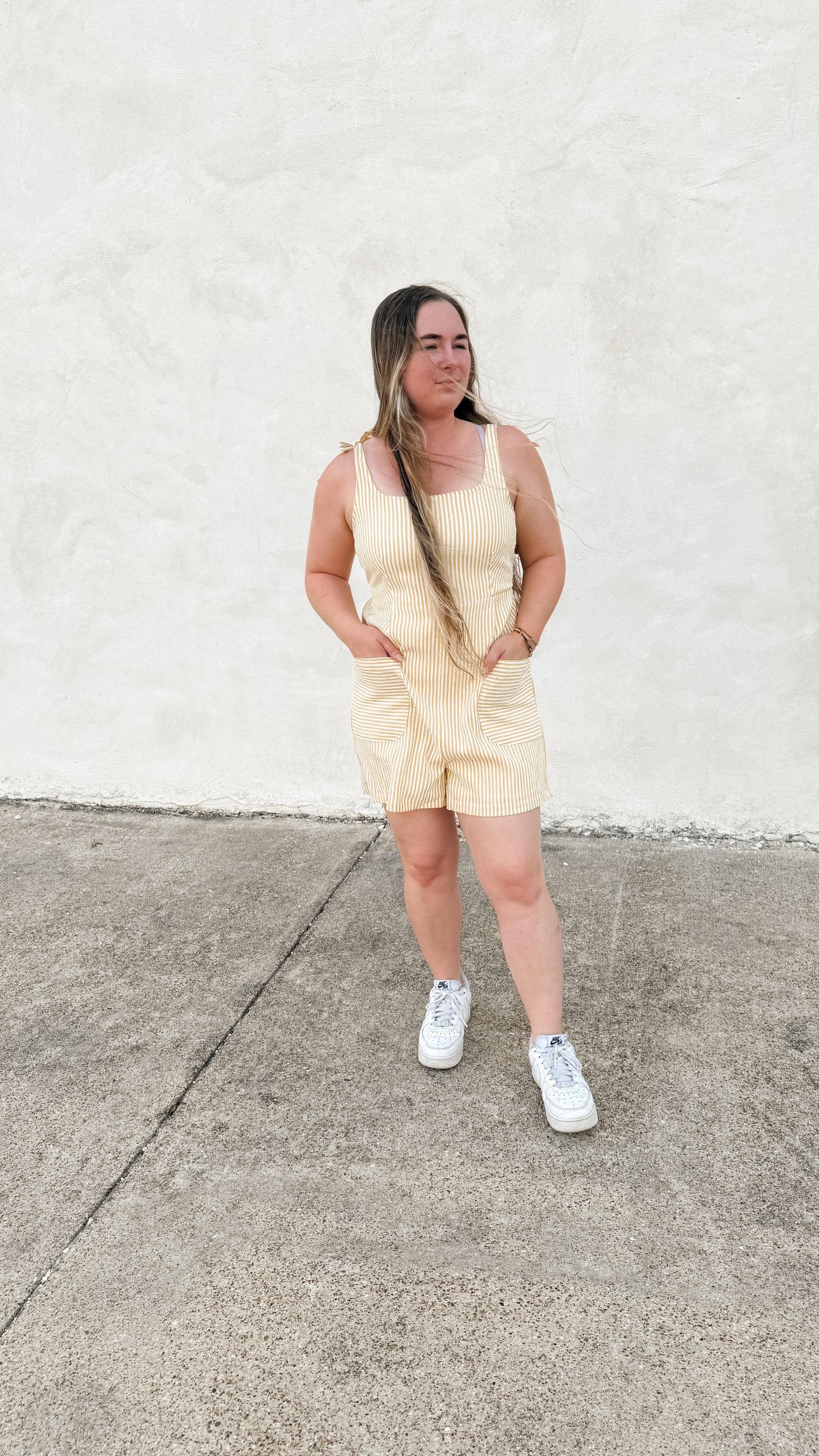 This sunny yellow romper brings a burst of brightness to your summer wardrobe! Featuring classic white stripes, a playful square neckline, and adjustable tied shoulders for a perfect fit. The smocked back adds comfort, while wide legs keep you cool and stylish. Plus, front pockets offer both function and flair—ready for all your sunny adventures!